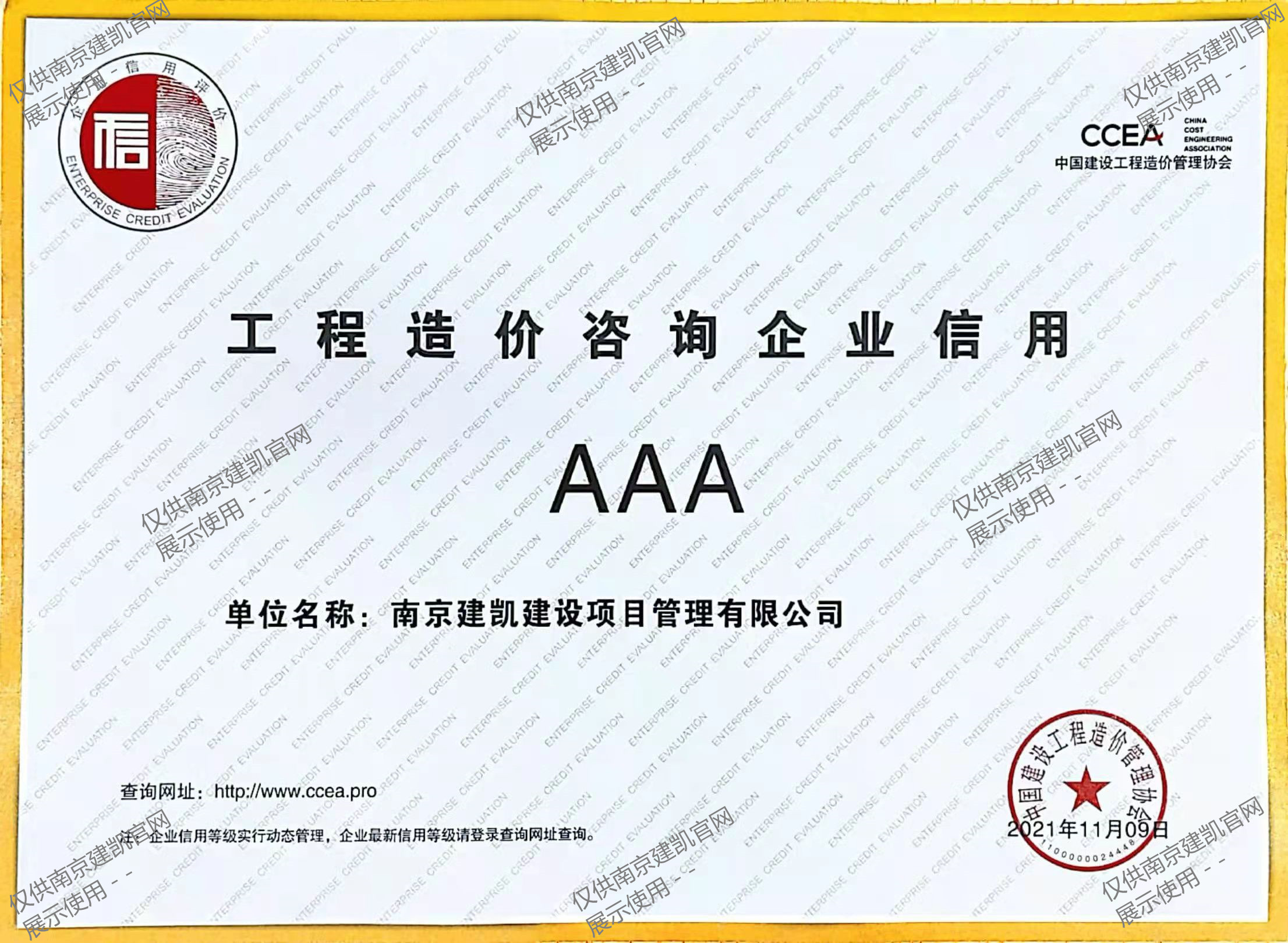 熱烈祝賀我司造價(jià)機(jī)構(gòu)在2021年11月9日榮獲中國(guó)建設(shè)工程造價(jià)管理協(xié)會(huì)頒發(fā)的“工程造價(jià)咨詢企業(yè)信用“AAA”等級(jí)證書(shū)”